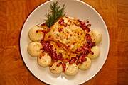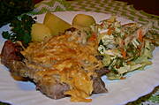 Kotlety drobiowe zapiekane z żółtym serem, posypane ostrą papryką, kluski śląskie ze skwarkami z wędzonego boczku.