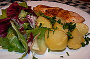 Filety drobiowe panierowane w orzechach arachidowych, ziemniaki, surówka z warzyw mieszanych :)
