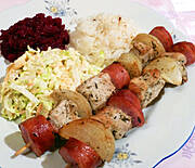 Szaszłyki, ryż, surówka z kapusty pekińskiej i buraczki zasmażane.