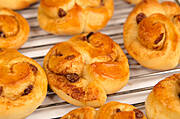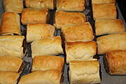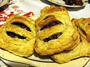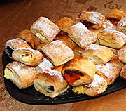 Ciasteczka francuskie z serem, budyniem, dżemem jagodowym i truskawkowym, posypane pudrem.:)
