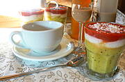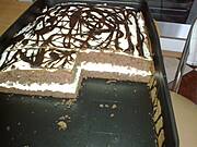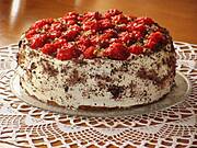 To torcik na biszkopcie z budyniem na zimno(bardzo fajny przepis), bita śmietana i mus truskawkowy z żelatyną, a serweta pojechała do Basi, nie dało się jej obronić