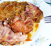 Wyszomko,4 średnie golonki włożyłam na dno garnka, na to około 2 kg kiszonej kapusty, dałam ziele angielskie, 2 liście laurowe, 2 pokrojone cebule, 2 starte na tarce marchewki, kilka grzybków suszonych, 2 łyżki powideł śliwkowych, 1 łyżkę kminku i 1 czubatą łyżkę majeranku. Wszystko zalałam wodą, żeby tylko kapusta była przykryta, i tak się gotowało około 3 godziny na małym ogniu, po tym czasie, gotowałam bez przykrycia jeszcze około 40 min.Wyjęłam golonki, usunęłam kości i dopiero wszystko dokładnie wymieszałam i doprawiłam pieprzem:) Golonki były i tak słonawe , bo kapusta puściła sól, w czasie gotowania.
