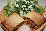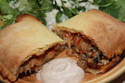 Wczoraj goszcząc znajomych i dzisiaj, bo trzy pyszności zostały.... Calzone z sosem ziołowo-czosnkowym + Sałata z rukolą do niej sos z serem roquefort.