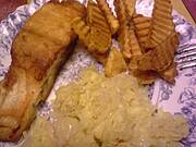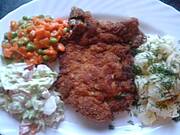 Kurczak w cieście z ziemniakami i sałatą z ogórkiem i papryką