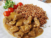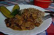 Biała kasza gryczana,gulasz z boczkiem i pieczarkami od zawiślaczki i ogórek ....