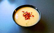 Końcówka rosołu z kostką z kaszy manny, barszcz biały chrzanowy, na szynce babuni z jajkiem, szczypiorkiem i ziemniakami, pokraszonymi skwarkami z przesmażoną cebulką, dla chętnych dojadanie naleśników.