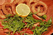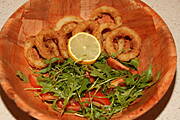 A ja Klamary w cieście i rukola z pomidorem, polana olejem rzepakowym i octem balsamicznym.