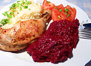 Podudzia z kurczaka pieczone,ziemniaki,surówka z kiszonej kapusty,sałatka z buraczków.