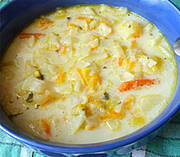 Lekka zupa jarzynowa i ryż z jabłkami i rodzynkami.