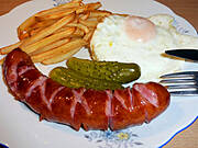 Wczorajsza zupka parzybroda, frytki, kiełbasa na jeża, jajko sadzone i ogórki konserwowe.