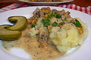 Gulasz pieczarkowo-drobiowy ,ziemniaki i ogórek konserwowy...