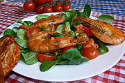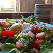 Roszponka,wędzone krewetki i łosoś ,pomidor,oliwa + grzanka ...