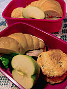 Jak prawie zawsze: filiżanka jogurtu naturalnego, banan i garść rodzynek. Ryś pankejka pomemlała, zjadła jabłko. Mężowski naleśniki z dżemem. Młode: omlet z serem. Do szkoly po kawałku Hermana, jabłko jedna, banana druga, sok.