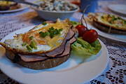 Grzanka z szynką i jajkiem sadzonym , zapieczona z żółtym serem + dodatki ...