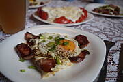 Jajecznica na wędzonej słoninie z cebulką, pieczywo.