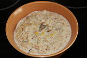 Kasza jaglana na gęsto z kiełbaską drobiową, jajkiem i przyprawami, kawa zbożowa "Kujawianka" z mlekiem :)