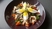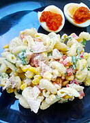 Sałatka z makaronu i kurczaka wg merylu, jajko na twardo z adżiką.