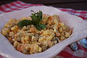 Sałatka z makaronu ryżowego,ogórka,kukurydzy i czosnku,przysmażona kiełbasa z cebulą + dodatki ...