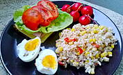 Sałatka (ryż, tuńczyk, kukurydza, papryka) + dodatki.