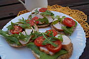 Grahamka podzielona na cztery części,filet wędzony z kurczaka,sałata,pomidorki koktailowe ,rukola...