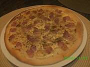 Ciasto pizzowe cieniutkie posmarowane kwasna tlusta smietana, na to ida kawaleczki wedzonego boczku. Poswypujemy odrobina rozmarynu lub tymianku i swiezo zmielonym pieprzem.