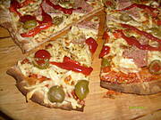 Też lubimy pizzę ze wszystkim co akurat dostępne. Ale akurat przypomniałam sobie pewien program telewizyjny daaaawno temu więc za bardzo nie pamiętam ale było coś w tym stylu,że pewien Włoch trzymał ciasto na pizzę baaardzo długo - parę dni, tygodni? w chłodnym miejscu (piwnicy) i ponoć to najlepsza pizza! Na razie nie próbowałam bo nie znam dobrze przepisu!