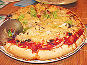 Lubimy pizzę , ale robię ją średnio raz w miesiącu . Przeważnie z szynką i pieczarkami i dużo sera . Jak nas naleci ochota na pizzę , to tak się najemy, że wystarcza nam na miesiąc , a nawet dwa.