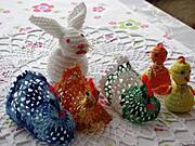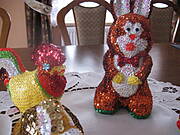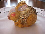 Kupuje się styropianowe zajączki,kurki,jajka,do tego cekiny(są tanie),szpileczki i do dzieła.