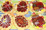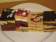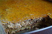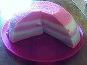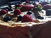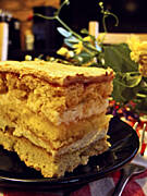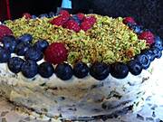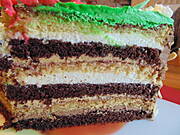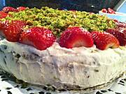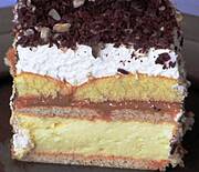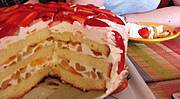 Proszę bardzo : Przekładaniec: Kruche ciasto, biszkopt, krem waniliowy, pijane rodzynki, dżem morelowy, truskawki, beza