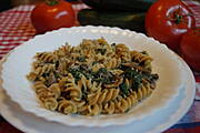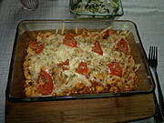 Makaron z mięsem, pieczarkami i cukinią zapieczony pod beszamelem i mozzarellą.