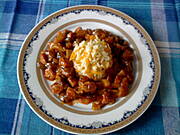 Gulasz wieprzowy ( 150 st gotowany przez 6 h ) ziemniaczki młode z koperkiem(