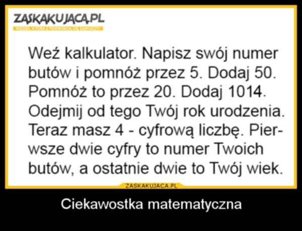 Witam, bardzo ciekawa zagada, dziekuje za jej wstawienie. matematycznie sprawa jest dosc prosta. Jesli przez x oznaczymy nr butow, a y-rok urodzenia to otrzymamy: 100x+(2014-y), czyli dokladnie w liczbie tysiecy i setek nr butow, a w liczbie dziesiatek i jednosci nasz wiek. jednym slowem w matematyce cudow nie ma, pozdrawiam i zycze milego liczenia.