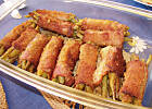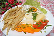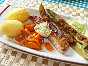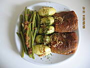 Filet z kurczaka smażony z kurkami w sosie śmietanowym, ziemniaki z zieleniną, smażona fasolka owinięta szynką szwarcwaldzką i panierowana.