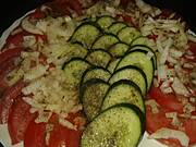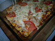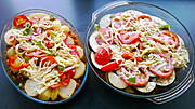 Inspirowałam się trochę przepisem Mircii, a poza tym trochę przepisem Asi z Kwestii Smaku. Ogólnie jednak robiłam jak zwykle "na czuja". Zależało mi, żeby zapiekanka "nie pływała", więc robiąc sos mięsno-pomidorowy mocno go odparowałam, podgotowałam też 10 minut ziemniaki (czego nigdy nie robię) co bardzo mocno wpłynęło na suchość zapiekanki - da się ją łatwo kroić, nie rozwala się, nie ma zbędnego sosu, dzięki czemu każda warstwa zachowała swój smak. Poszłam też na łatwiznę - ani bakłażana, ani cukinii nie podsmażałam, nie grillowałam. Posoliłam tylko plastry i odstawiłam by puściły sok, a później przepłukałam i osuszyłam. Układałam na przemian, także oba warzywa znalazły się również wewnątrz zapiekanki, cudnie zmiękły i nie spowodowały, że wszystko pływało.