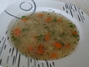 Rosół wołowo-drobiowy z makaronem i: dla mnie kaszotto z szynką i cebulką, dla połówka wołowina z ziemniakami, pomidorem i ogórkiem małosolnym.
