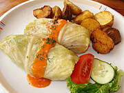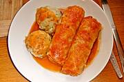 Gołąbki z mięsem i kaszą gryczaną w sosie pomidorowym, puree ziemniaczane z zieleniną.