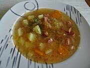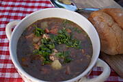 Gęsta zupa z grochu zielonego z boczkiem ,kiełbasą i mięsem + bułka ...