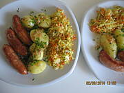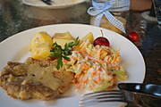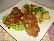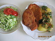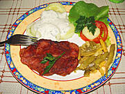Dziś u nas panierowane, pikantne kotlety z łopatki, pieczone ziemniaki, surówka z pora, marchewki i jabłka, ogórki i pomidory z cebulą, sos czosnkowy, chutney śliwkowy z przepisu Bahusa :)