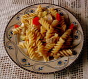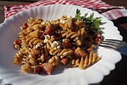 Makaron razowy z boczkiem ,kabanosami,serem białym i cebulką ...