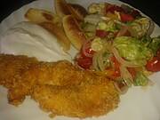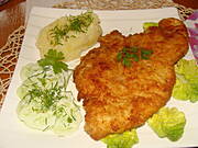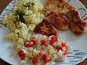 -filety z kurczaka w panierce qqrydzianej,ziemniaki,ogórek,kalafior.