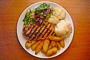 Grillowany filet z kurczaka, smażone ziemniaki, kalafior, mix sałat z czosnkowym winegretem.