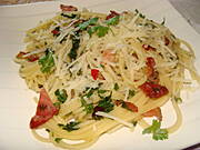 Spaghetti aglio olio wg heiworth z piri-piri, kolendrą i grana padano.
