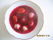 barszcz czerwony "solo", kluski ziemniaczane z mięsem zwane "kartaczami", ogórek małosolny