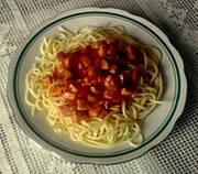 Ja w sumie to co na śniadanie, czyli jajko w warzywach, Młode spaghetti z sosem bolońskim długo i powoli gotowanym. Na deser owoce: winogrona, arbuz, jabłka i ananas.