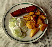 Zupa ogórkowa i w ramach koncertu życzeń kiełbasa przysmażana,ziemniaki pieczone,mizeria.