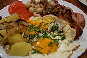 jajka sadzone,ziemniaki ,kiełbasa,cebulka przysmażona,pomidory i pieczarki marynowane ...
