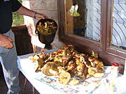 Łikend za to bardzo udany pogodowo i grzybowo.... W piątek po kawce ruszyliśmy spacerkiem przez las i z przyjemnością zapełnialiśmy kosze grzybami.... W sobotę na śniadanie teściowa zrobiła jajecznicę na kurkach i rydzach.....pycha. My z M spędziliśmy trzy godzinki na łódce wędkując i wróciliśmy na obiad..... już była gotowa zupa na świeżych podgrzybkach i zielonkach, mężowaty usmażył świeżo złowione rybki, a ja posmażyłam kanie.... ( dary lasu i jeziora ) kolację już sobie podarowaliśmy :) ...no nie licząc piwka..... Totalnie udany koniec soboty, bo Polska górowała nad Niemcami ...jupiii!!!!
