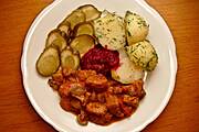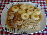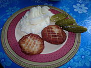 Kluski na parze, bitki wołowe w sosie własnym i ogórek kiszony