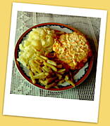 Filet z kurczaka zapiekany pod marchewką,ziemniaki,fasolka szparagowa z bułką tartą.