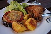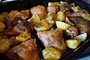 Udka pieczone z ziemniakami,cebulą i czosnkiem ,bakłażan zapiekany z pomidorem i serem ,sałata...